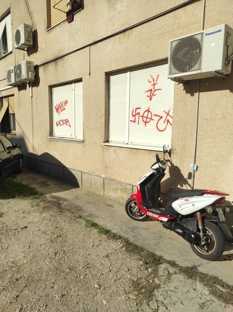 U prizemlju zgrade u Splitu u Ulici Hrvatskih iseljenika nepoznati počinitelji išarali su prozore zgrade grafitima mržnje.