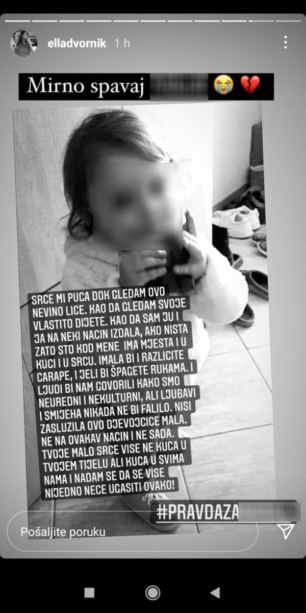 "Imala bi i različite čarape i jeli bi špagete rukama. I ljudi bi nam govorili kako smo neuredni i nekulturni, ali ljubavi i smijeha nikad ne bi falilo. Nisi zaslužila ovo djevojčice mala. Ne na ovakav način i ne sada. Tvoje malo srce više ne kuca u tvojem tijelu, ali kuca u svima nama i nadam se da se više ni jedno neće ugasiti ovako", završila je u nastavku poznata Ella Dvornik.