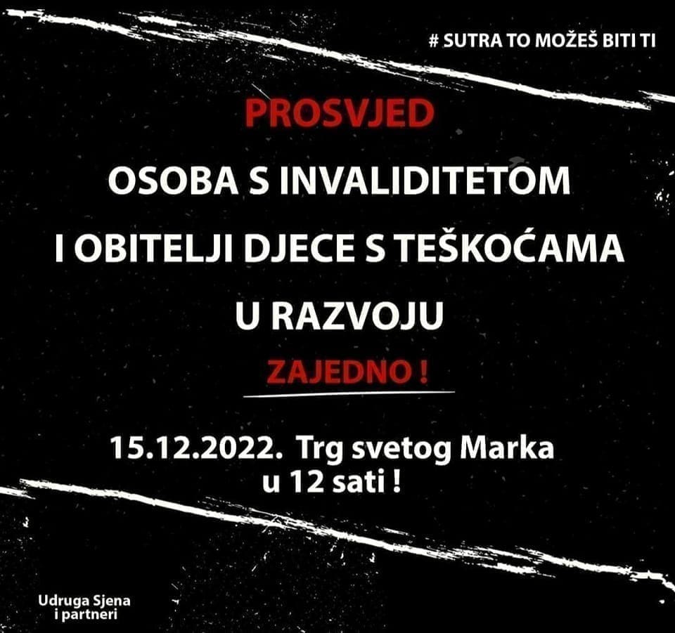 Podsjetimo još jednom kako će se u četvrtak, 15. prosinca na Trgu svetog Marka točno u podne održati prosvjed osoba s invaliditetom kojim se traži konačno donošenje Zakona o inkluzivnom dodatku, konačno donošenje Zakona o osobnoj asistenciji i žurno osiguranje pomoći i podrške roditeljima djece s teškoćama u razvoju, koji su prepušteni sami sebi nakon što dijete napuni 8 godina.