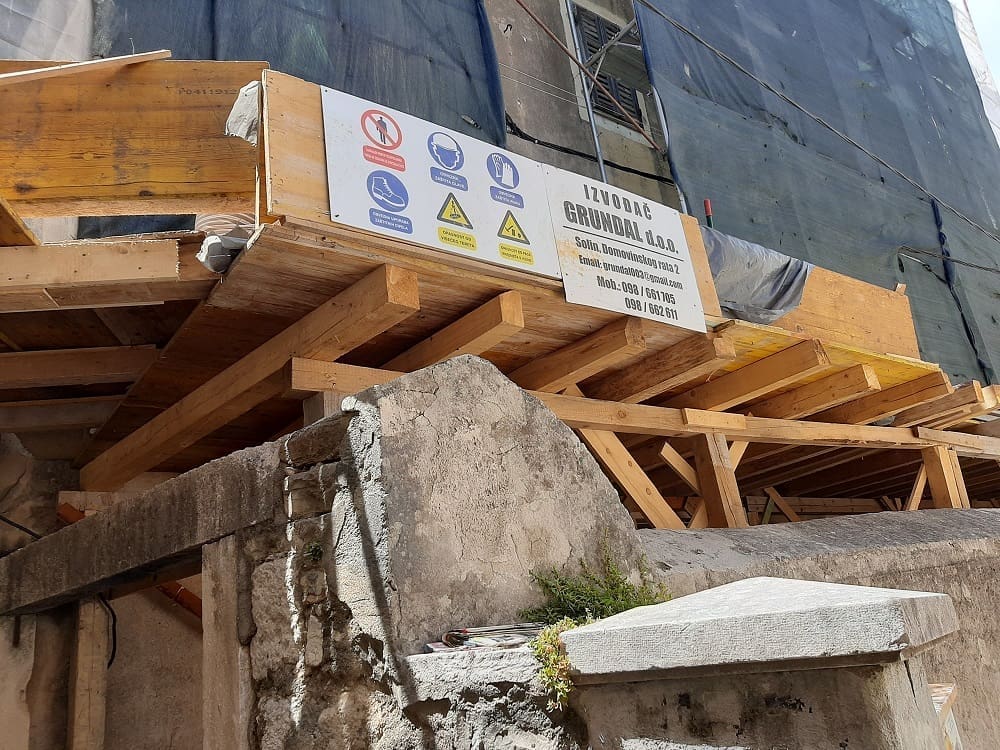 I imali smo što vidjeti. Naime, u Križevoj ulici nasuprot broja 37, uz crkvu Svetog Križa, radi se rekonstrukcija stare kamene zgrade, ali tako što se šut kojeg već danima izvlače građevinski radnici iz kuće, donosi u vrećama do ulice, putem montirane drvene konstrukcije.