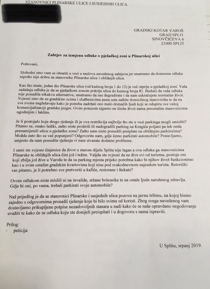 - Htjeli smo da peticija bude legitimna, prikupljali smo potpise samo onih ljudi koji žive u Plinarskoj i oko nje. Usporedbe radi, u kotaru je za pobjedu na prošlim izborima bilo potrebno 150 glasova, a mi smo u nekoliko ulica prikupili 144 potpisa. A članovi kotarskog vijeća, umjesto da se zauzmu, sad prebacuju lopticu na stari saziv. Kotarsko vijeće je to koje je htjelo da Plinarska bude proglašena pješačkom pod uvjetom da nam se osiguraju parking mjesta. Parking mjesta nam se nisu osigurala, a oni nam sad kažu: "Čekaj 2-3 godine pa će se možda napravit parking" i mi se moramo sami snalaziti i smišljati što i kako dalje. Pozivamo Grad da organizira tribinu na kojoj ćemo se prikupiti u velikom broju. Tražimo da se odluka o pješačkoj zoni ukine do izgradnje parkinga - govori nam jedan od inicijatora peticije, Frane Peruzović, napominjući kako stanari nisu protiv proglašenja pješačke zone, ali žele da im se ponudi alternativa.