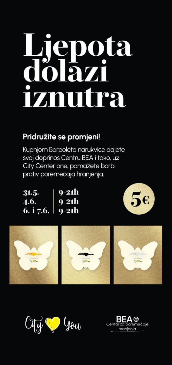 Budite i vi dio promjene – u sklopu postava projekta “Ljepota dolazi iznutra”, kupnjom Borboleta narukvice na dane 31.5., 4., 6. i 7. lipnja od 9 do 21 h u City Centeru one u Splitu, dajete veliki doprinos Centru BEA te pomažete u borbi protiv poremećaja hranjenja.