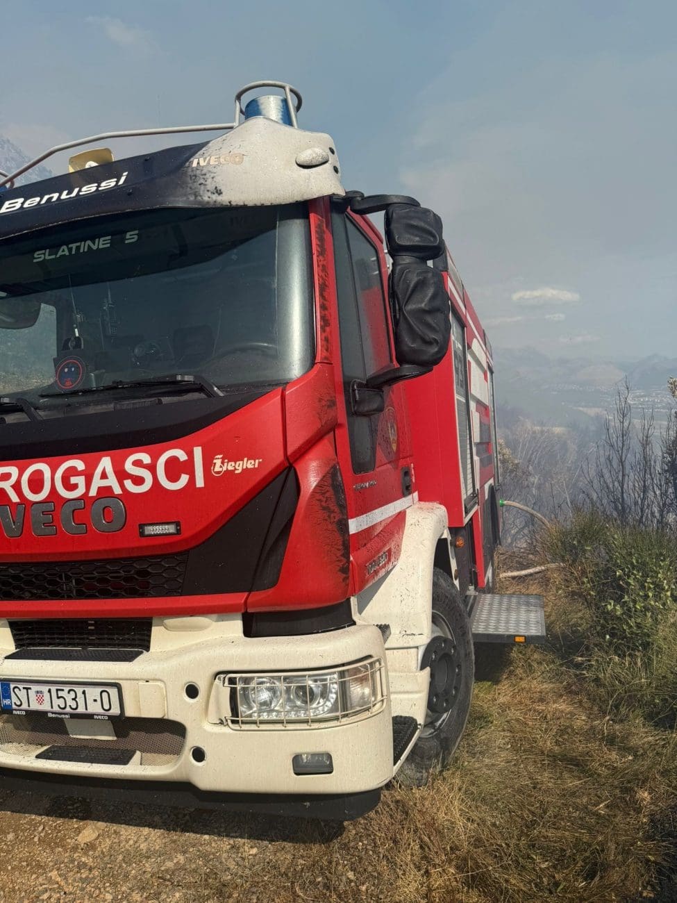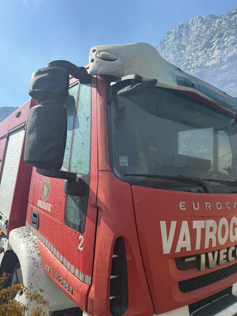 "Na današnjem požaru u Kaštelima oštećena su 2 kamiona DVD -a Okruk i DVD-a Slatine.. kolege su ih uspili obraniti da ne dođe do zapaljenja kamiona.. srećom sve je prošlo samo s materijalnom štetom kolege su dobro", objavili su uz fotografije oštećenih vozila.