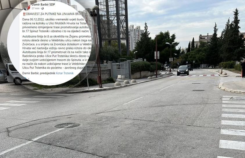 "Dana 06.12.2022. ukoliko vremenski uvjeti budu dozvoljavali planira se izvođenje građevinskih radova na kolniku u Ulici Moliških Hrvata na Trsteniku, pa će sukladno navedenom doći do privremeno izmijenjene trase prometovanja autobusnih linija br.8 Žnjan – Zvončac i obratno, i br.17 Spinut Trstenik i obratno i to na sljedeći način: