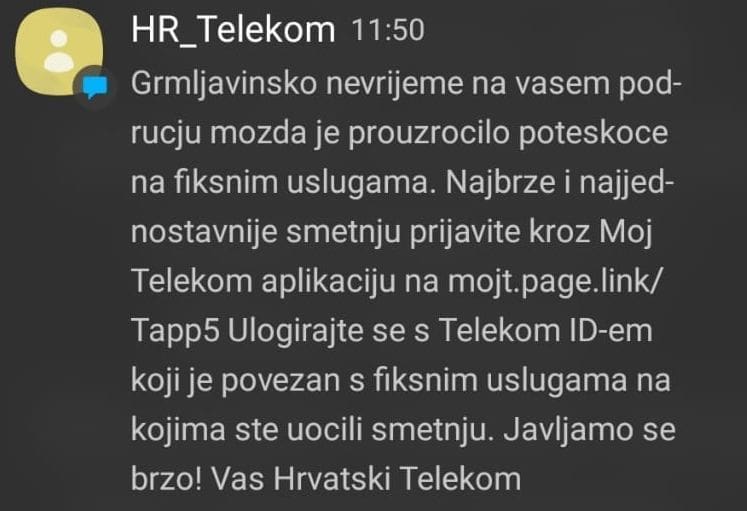 - Grmljavinsko nevrijeme na vašem području možda je prouzročilo poteškoće na fiksnim uslugama. Najbrže i najjednostavnije smetnju prijavite kroz Moj telekom aplikaciju - izvijestili su.