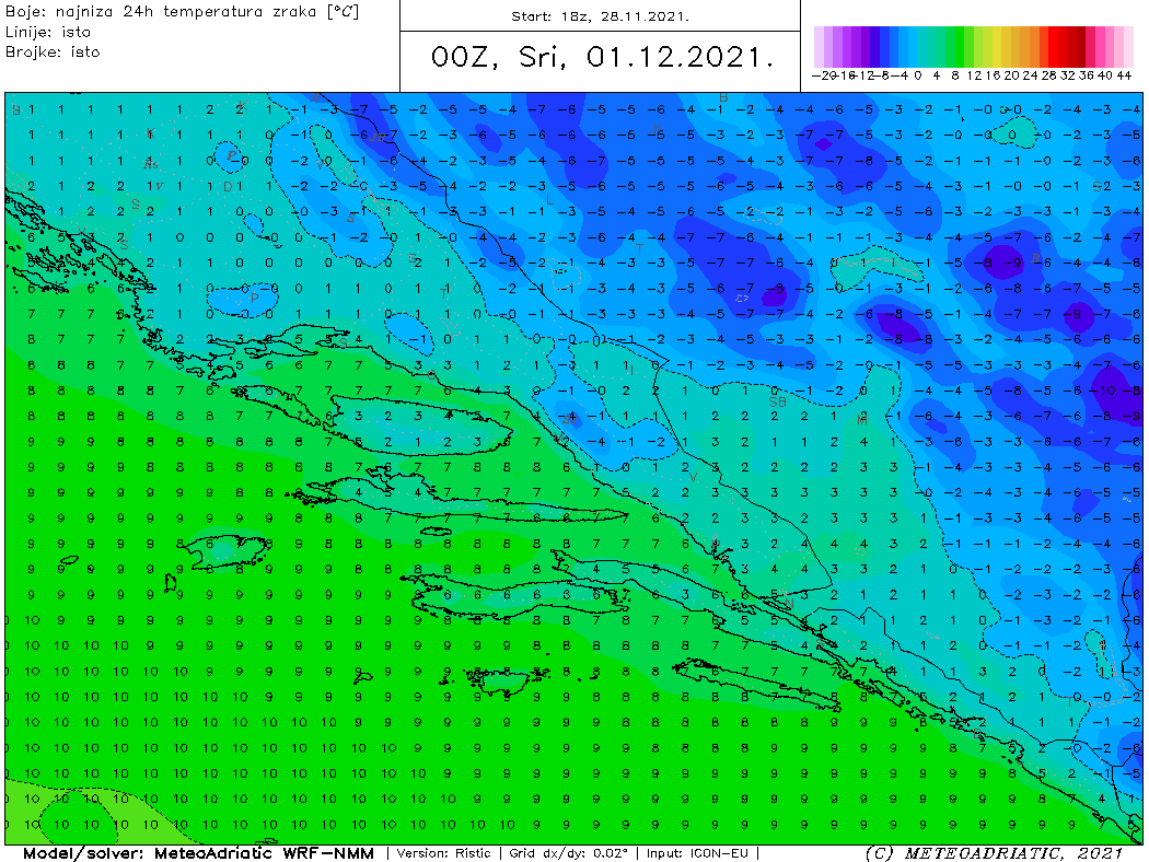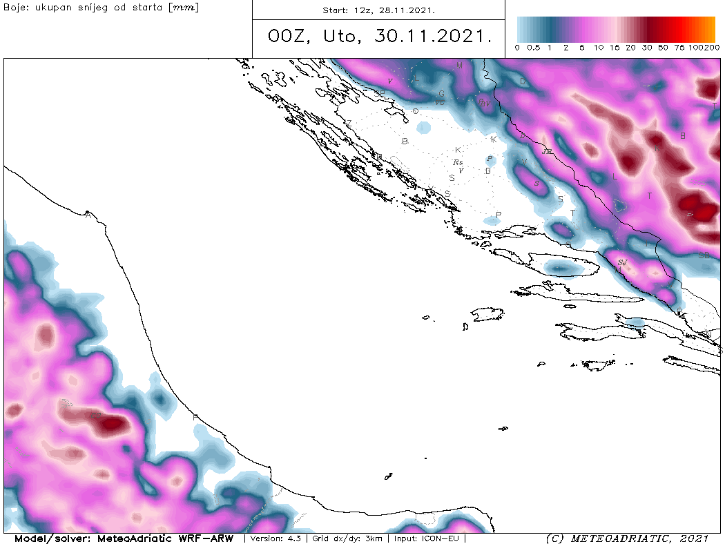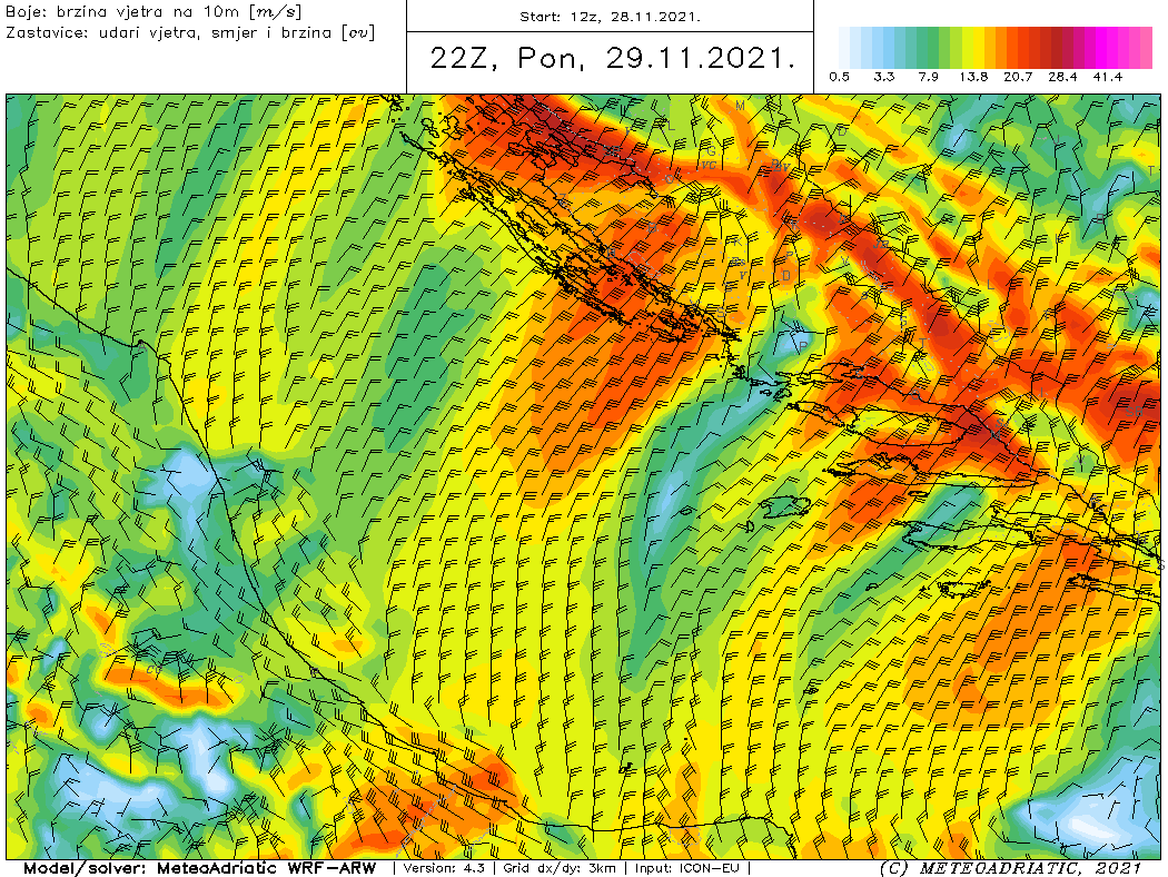 U ponedjeljak nas očekuje umjereno do znatno oblačno vrijeme. Iako će biti povremenih oborina, one u većini predjela neće biti obilne ni česte kao prethodnih dana. Najviše kiše bit će na jugu Dalmacije, a najmanje na sjeveru. U planinama, osobito u drugom dijelu dana, doći će do spuštanja snježne granice. Navečer snijeg u Zagori može padati do 400 metara nadmorske visine, a na obalnom gorju i na Vidovoj gori na Braču iznad 600 metara. Tako bi prvi snijeg ove jeseni mogao pasti na Mosoru, a susnježice bi moglo biti nadomak Splitu, u višim predjelima Klisa. Oborine će navečer prestati na sjeveru Dalmacije, potom i u srednjoj. Još u noći će puhati umjerena tramontana, danju će prestati i okrenuti na levant, ponegdje na moru i jugo. Već ujutro podno Velebita će zapuhati jaka bura, popodne i navečer će se širiti na ostatak obale. Navečer se posvuda očekuje jaka bura s olujnim udarima, podno Velebita i Biokova i s orkanskim udarima. Minimalne jutarnje temperature zraka od 2°C ponegdje u Zagori, do 12°C ponegdje na jugu. Najviše dnevne temperature od 7 do 13°C. Navečer osjetno hladnije, a osjet hladnoće dodatno će povećavati bura.