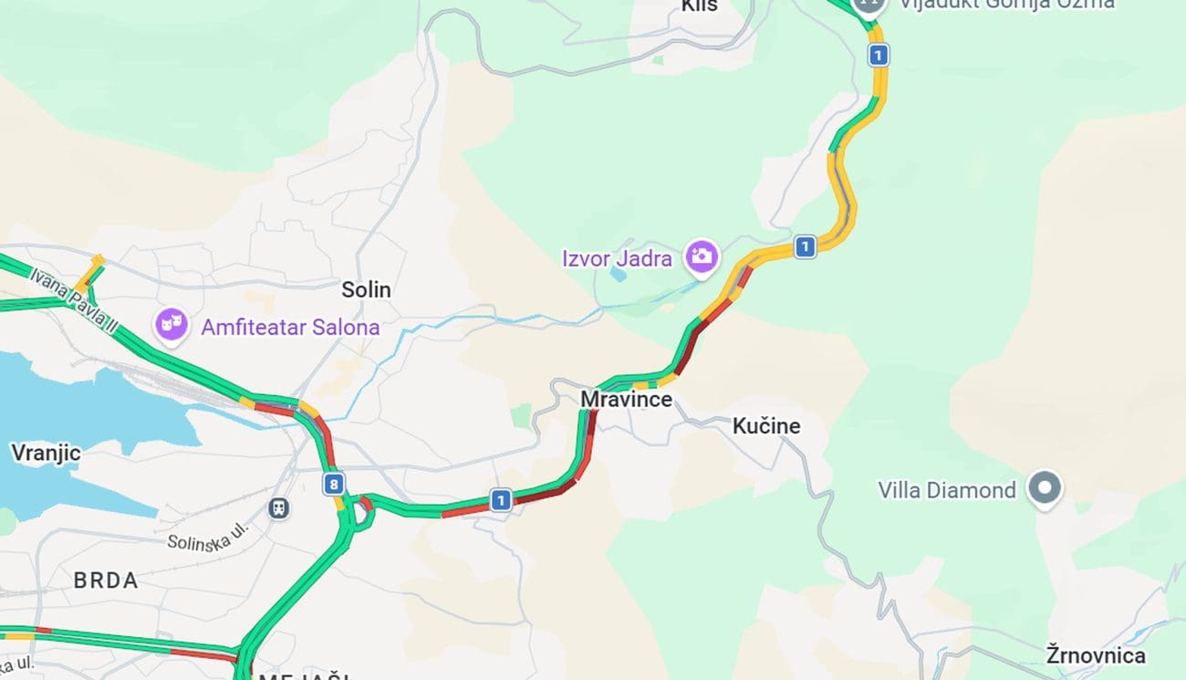 Prema informacijama iz Google aplikacija za promet, zabilježena je veća gužva gotovo duž cijele dionice — od Solina pa sve do Klisa — uz usporenu vožnju i povremena zadržavanja.