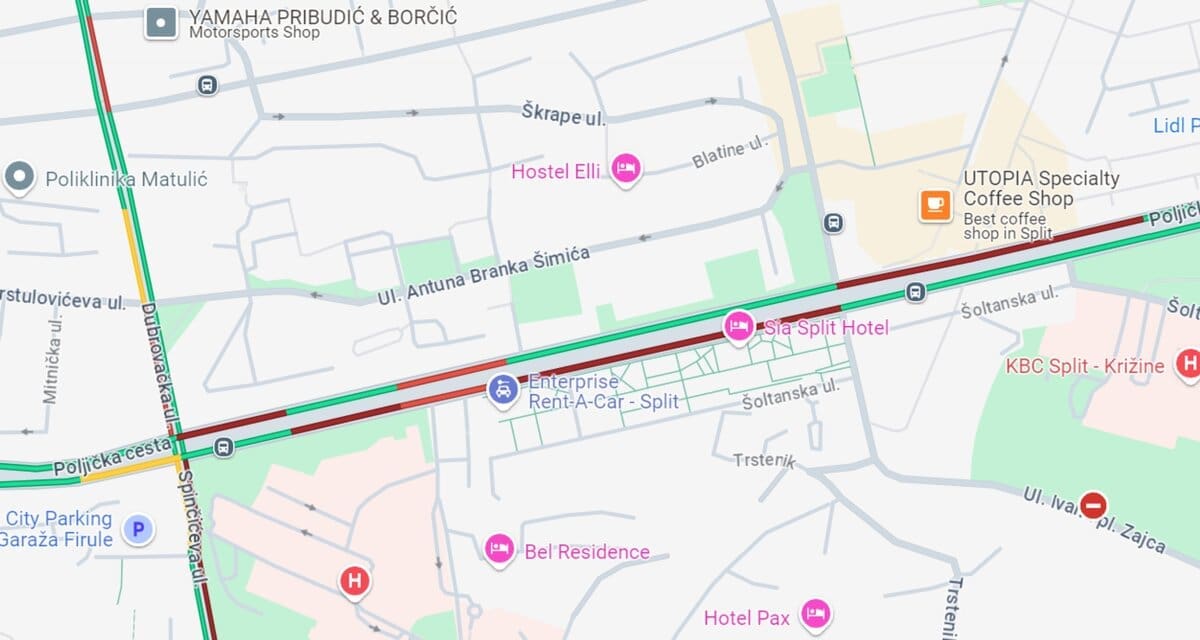 Danas se Poljička cesta u Splitu suočava s ozbiljnim prometnim gužvama. Mnogi vozači izvještavaju o otežanom prometu, posebno zbog mokrih i skliskih uvjeta na cesti. Vozači apeliraju na ostale da budu oprezni i strpljivi, budući da su uvjeti vožnje postali izazovni. S obzirom na vremenske prilike, skliske površine dodatno otežavaju vožnju i povećavaju rizik od nesreća. Svi sudionici u prometu pozvani su da prilagode svoju brzinu i povećaju razmak između vozila, kako bi osigurali sigurniju vožnju.