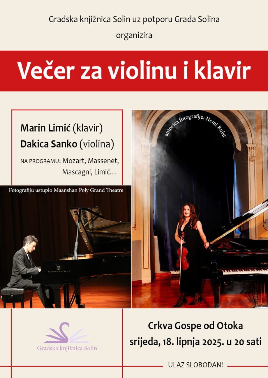 Povodom nadolazećeg Svjetskog dana glazbe, Gradska knjižnica Solin u suradnji s Gradom Solinom organizira koncert za istinske ljubitelje klasične glazbe. "Večer za violinu i klavir", kako glasi naslov koncerta, održat će se u srijedu, 18. lipnja u 20 sati u Crkvi Gospe od Otoka.