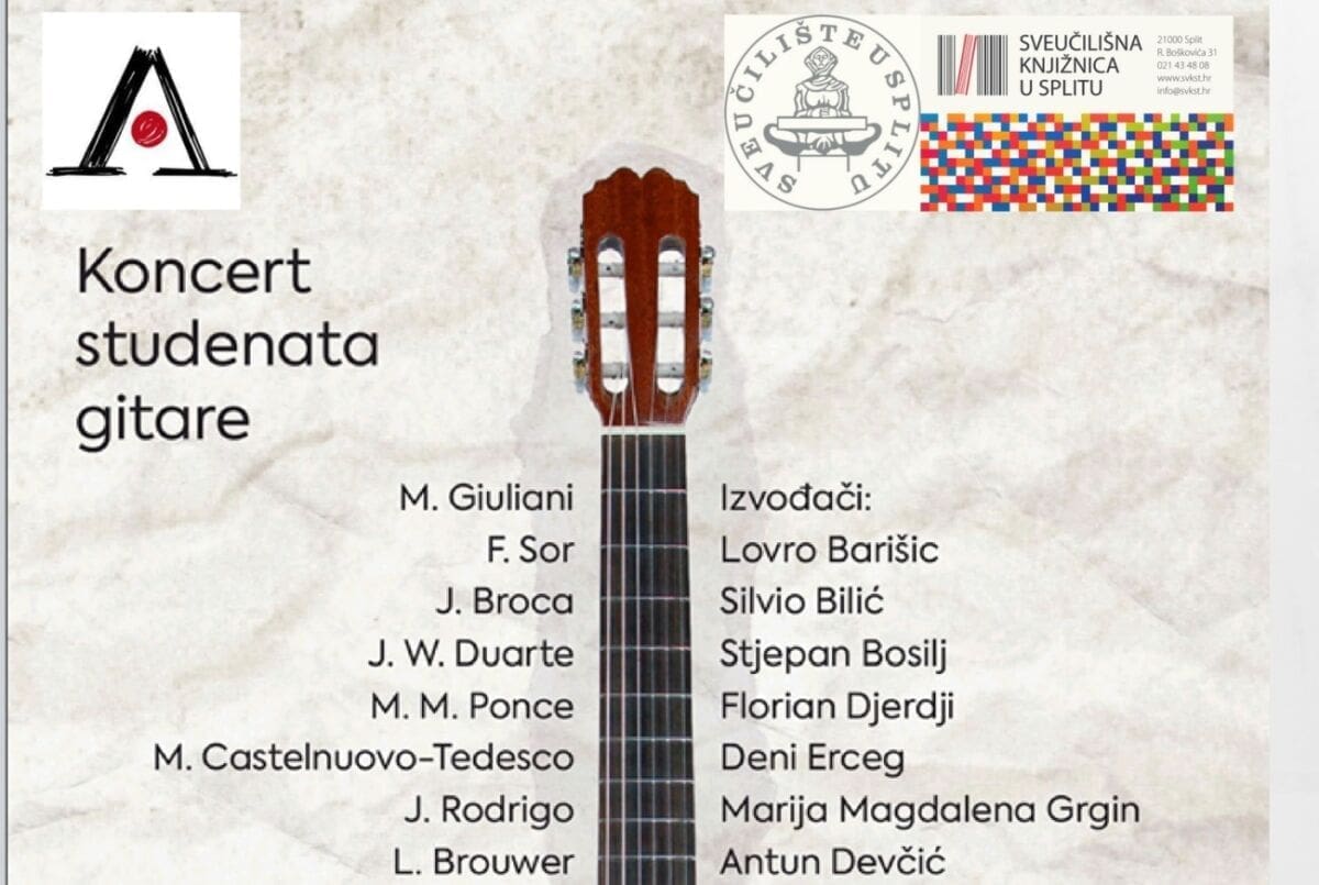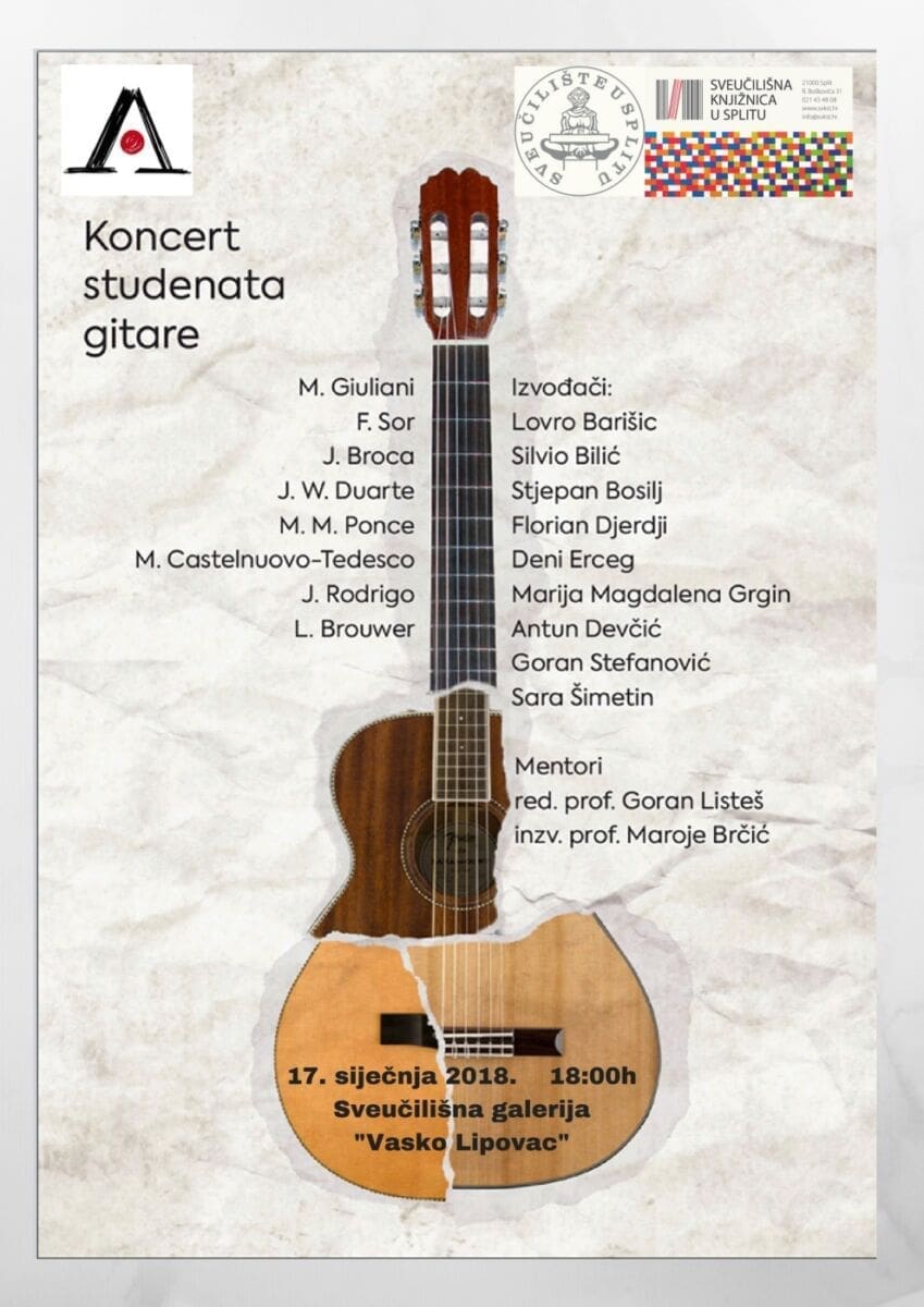 Koncert studenata gitarističkog odjela Umjetničke akademije u Splitu u klasama prof. Maroja Brčića i prof. Gorana Listeša, održat će se večeras, 17. siječnja, s početkom u 18 sati u Sveučilišnoj galeriji "Vasko Lipovac".