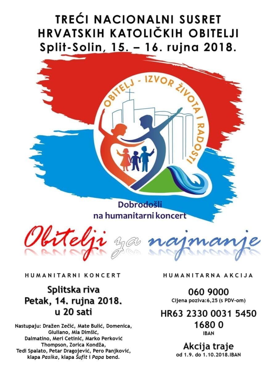 U prigodi Trećega nacionalnog susreta hrvatskih katoličkih obitelji koji će se održati 15. i 16. rujna u Splitu i Solinu, a kojemu je domaćin Splitsko-makarska nadbiskupija, večeras s početkom u 20 sati na splitskoj Rivi održat će se humanitarni koncert "Obitelji za najmanje".
