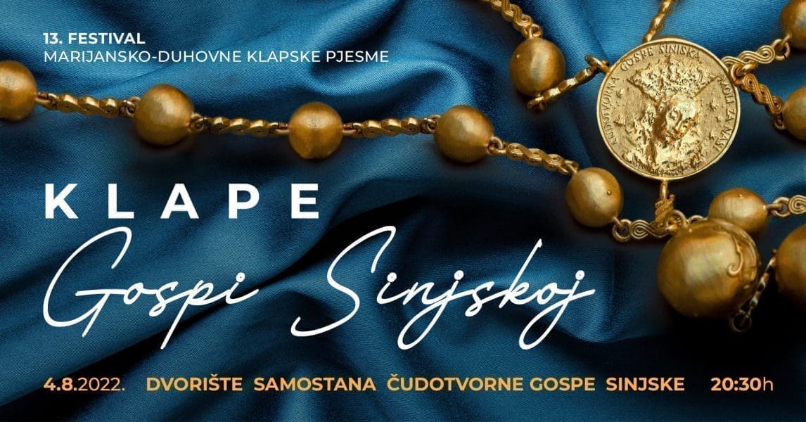 U organizaciji udruge ‘Klape Gospi Sinjskoj’, suorganizaciji Grada Sinja i Svetišta Gospe Sinjske, u dvorištu crkve Čudotvorne Gospe Sinje večeras u 20,30 sati bit će održan 13. Festival marijansko – duhovne klapske pjesme ‘Klape Gospi Sinjskoj’.