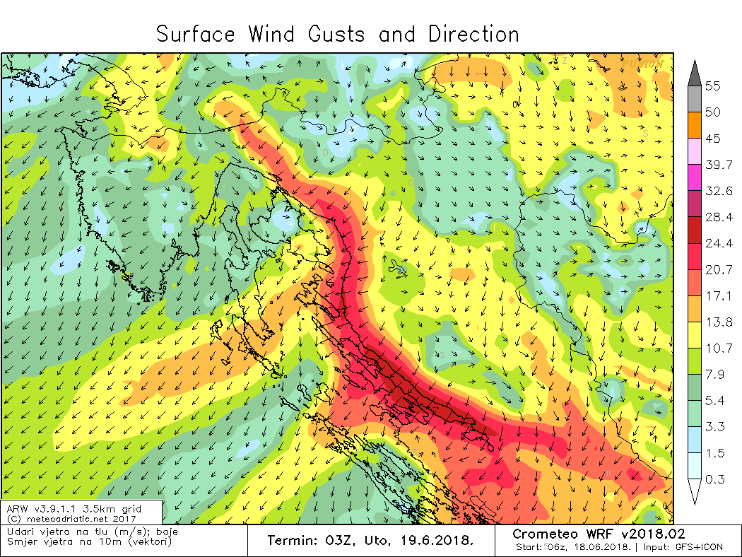 Danas će do kraja dana biti stabilno, a večer i noć na utorak će obilježiti ljetna bura. Iako će upravo zbog bure u većini predjela noć biti toplija nego je to uobičajeno, ponegdje se očekuju problemi s vjetrom. Tako će u nadolazećoj noći na cijeloj obali puhati umjerena bura s jakim, a ponegdje i olujnim udarima. Podno Velebit bura će biti olujna s orkanskim udarima koji ne bi trebali prelaziti 130 km/h.