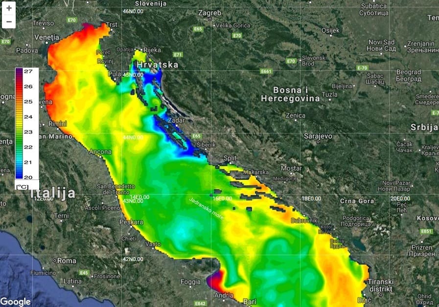 Površinske temperature mora su od svježih 20 stupnjeva na šibenskom području do 27°C na Mljetu.