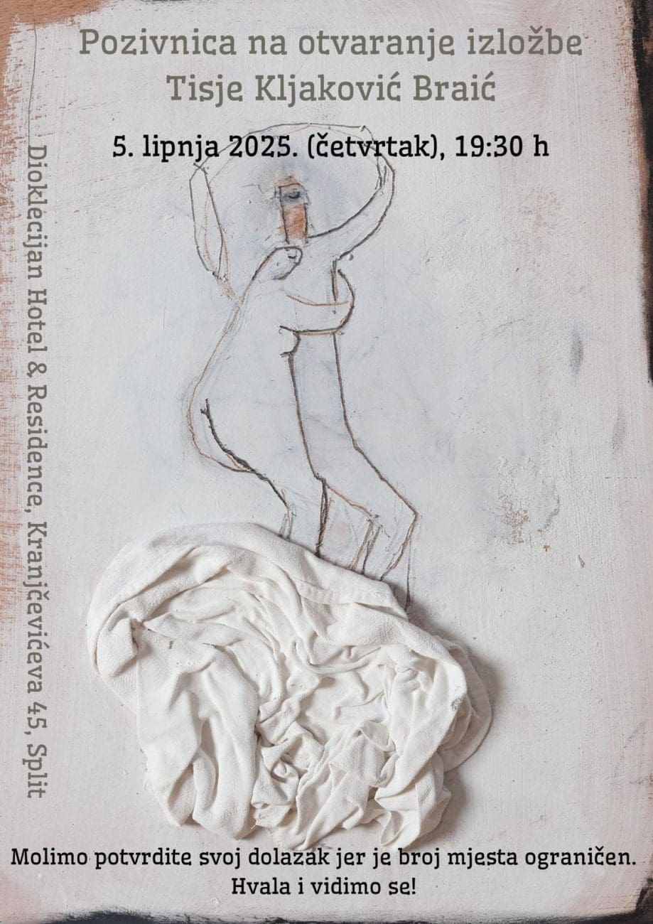 U večernjim satima, točnije u 19:30 sati, na drugom katu Dioklecijan Hotel & Residencea (Kranjčevićeva 45, Splitska kuća zdravlja), otvara se nova izložba poznate splitske umjetnice Tisje Kljaković Braić.