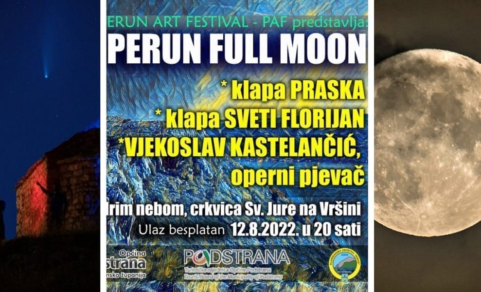 Naime, prvi u nizu bit će jedinstveni Full Moon Perun, susret tradicionalnih dalmatinskih klapa u noći punog mjeseca. Sve će početi u petak, 12. kolovoza 2022. iza 20 sati. Voditelj programa je poznati radijski voditelj Vedran Očašić.
