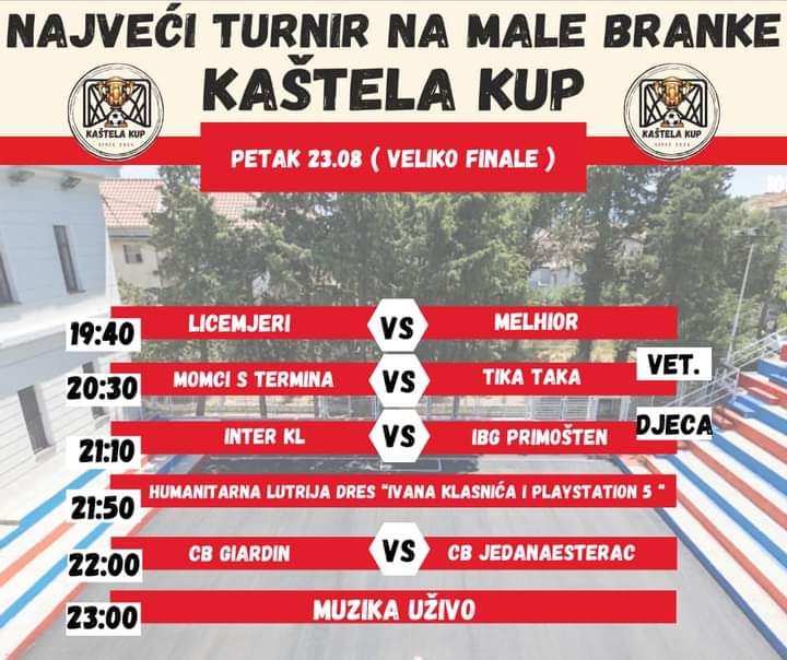 Najveći turnir na male branke, Kaštela Kup 2024, dolazi do svog spektakularnog finala u petak, 23. kolovoza. Finale će se održati na terenu u Kaštelima, a očekuje nas večer puna uzbuđenja, napetih utakmica i odlične zabave.