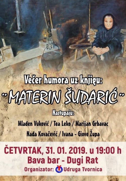 U organizaciji udruge "Tvornica" Dugi Rat u popularnom kafiću "Bava bar" na dugoratskoj plaži u četvrtak, 31. siječnja 2019. s početkom u 19 sati održati će se "Večer humora" uz predstavljanje knjige "Materin Šudarić" Marijana Grbavca - Mirića, glumca, redatelja, scenarista, osnivača i voditelja Dramskog ansambla Proložac.