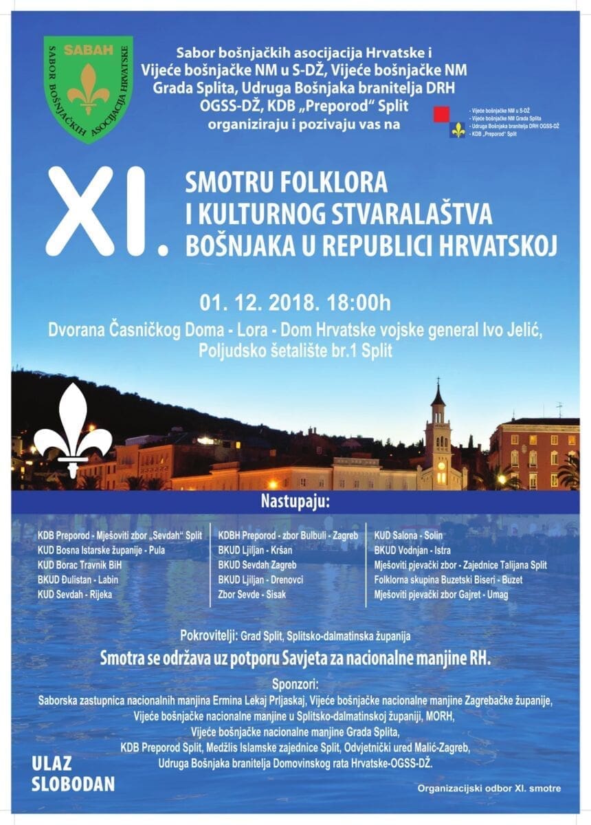 Večeras u 18 sati se održava XI. Smotra folklora i kulturnog stvaralaštva Bošnjaka u RH na kojoj sudjeluje 15 KUD-ova i KD iz cijele RH i gosti iz BiH.