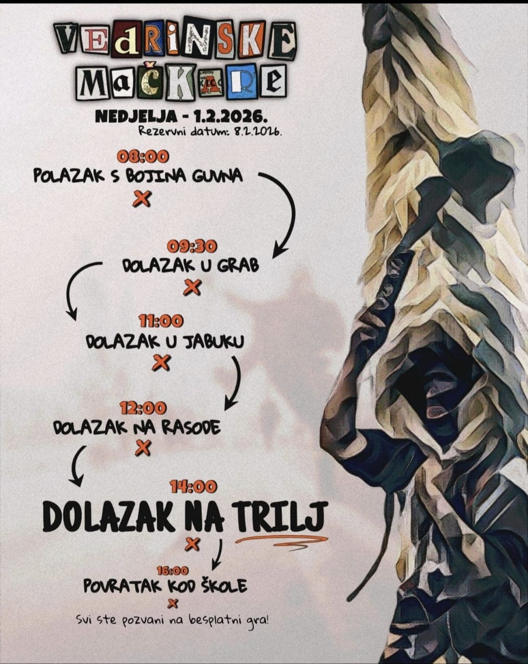 U nedjelju, 1. veljače 2026., u svoje pohode kreću Vedrinske mačkare. Polazak povorke predviđen je u 8 sati s Bojina guvna, odakle se kreće prema Grab-u, gdje bi trebali stići oko 9.30 sati. Nakon toga mačkare nastavljaju iz Graba prema Jabuci, s planiranim dolaskom oko 11 sati. Poslije Jabuke povorka ide na Rasode, gdje je oko 12 sati planiran ručak. Nakon ručka slijedi nastavak puta prema Trilju, a dolazak u centar grada očekuje se oko 14 sati.