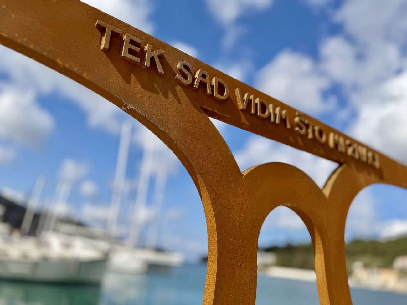 Autor instalacije je dizajner i umjetnik Saša Prižmić, koji je projekt osmislio kao spoj spomen-obilježja i turističke atrakcije. Instalacija je zamišljena i kao photo point – mjesto na kojem se posjetitelji mogu fotografirati i ponijeti uspomenu iz Vele Luke, uz hashtag #teksadvidim, koji se referira na poznati stih Branka Žuvele: Tek sad vidim što mi znači Vela Luka, more, ti… Ideja je da fotografije nastale uz insalaciju, uz korištenje hashtaga, nastave živjeti na društvenim mrežama i tako dodatno promoviraju mjesto i njegovu priču.