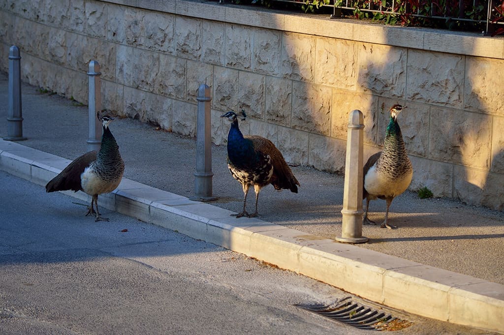 Popodnevni đir Gripama bio je sve osim uobičajen. Mjesto ljudi, ulicama šetaju paunovi. Nije ništa čudno da u tom splitskom kvartu paunovi šetaju po cesti, navikli smo na tu sliku, ali ovoga puta malo su si dali oduška. Nema ljudi, nema ih tko gnjaviti, trčati za njima da bi ih fotografirao... pa su paunovi mogli paradirati 'po splitski', laganini. Pametno su iskoristili ljudsku karantenu i cestu bez automobila, pa su se prošetavali u svim smjerovima.