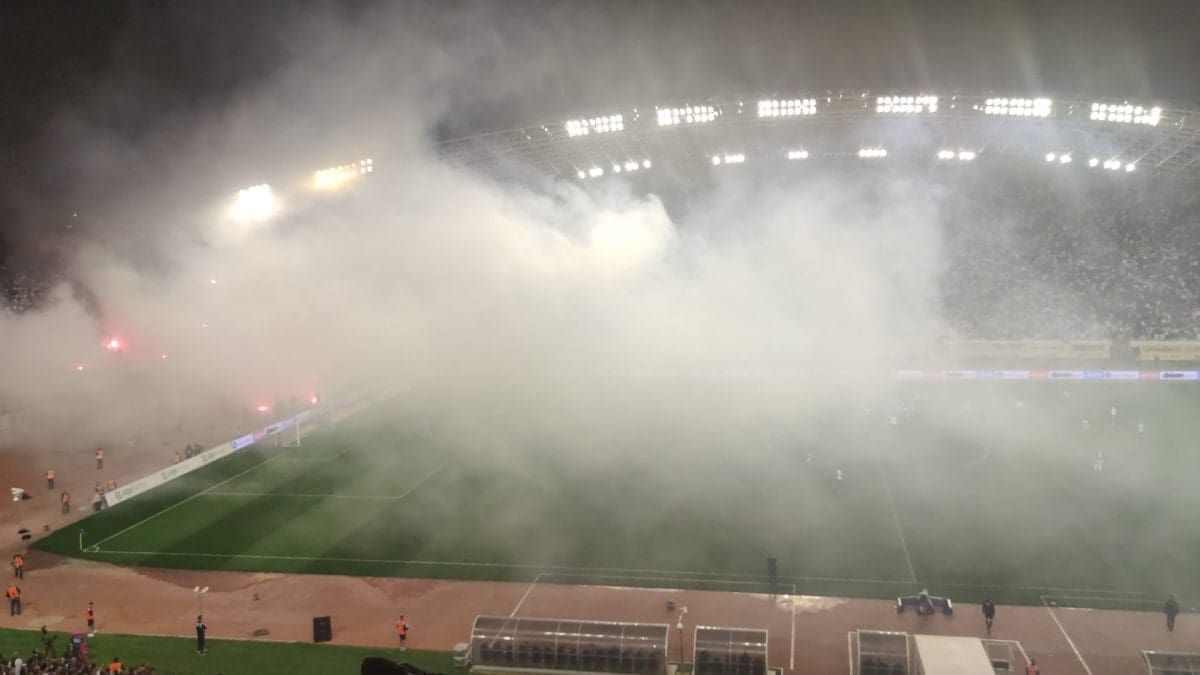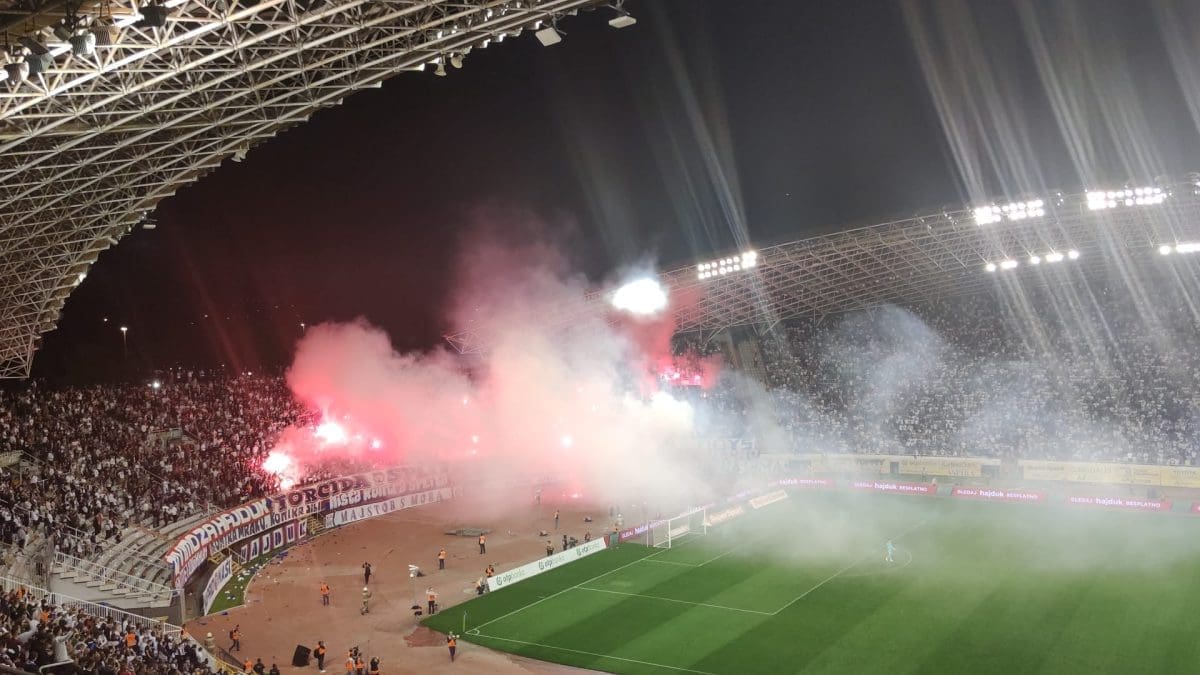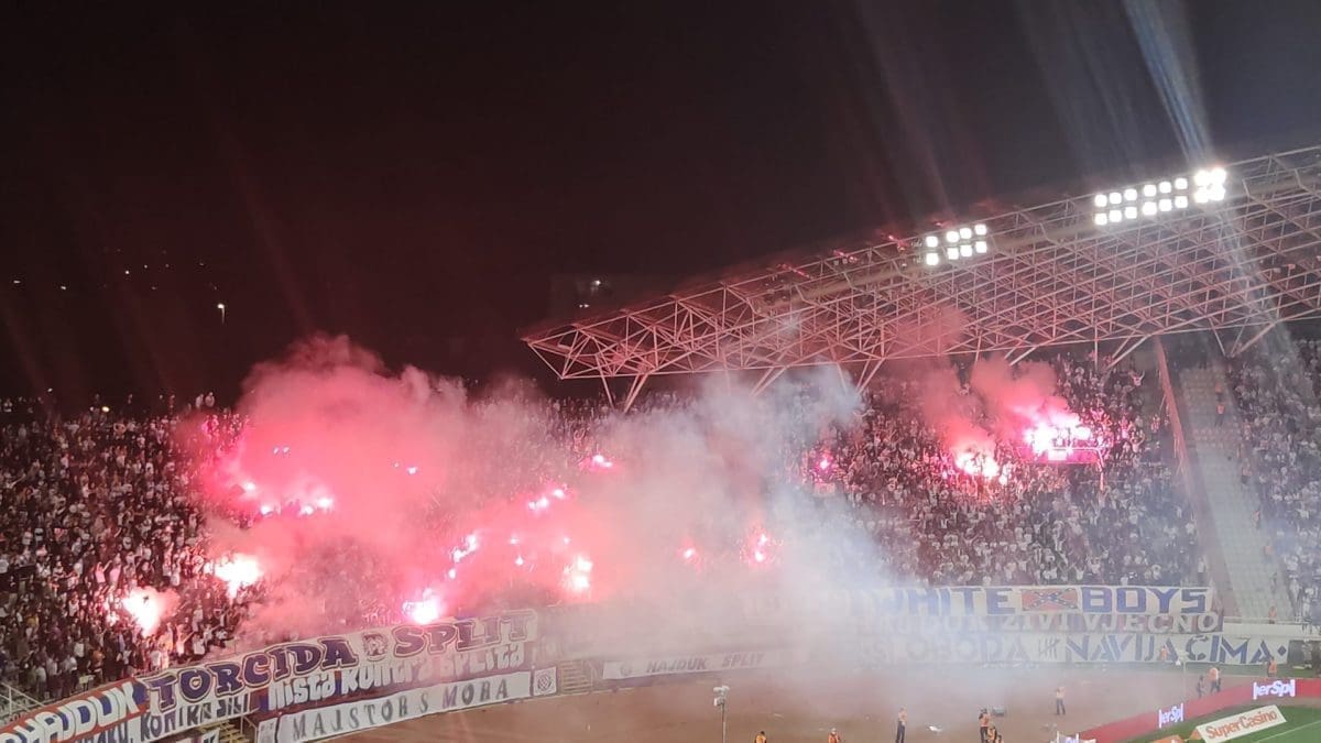 Podijeli Facebook Twitter Telegram WhatsApp E-mail adresa Hajduk vodi 1-0 u derbiju 14. kola, a atmosfera na krcatom Poljudu je užarena. Sudac Pajač zaustavio je igru u 63. minuti zbog bakljade, odnosno zbog dima na travnjaku. Susret je nastavljen u 64. minuti. Moja reakcija na članak je... Ljubav 0 Haha 0 Nice 0 What? 0 Laž 0 Sad 1 Mad 0 Facebook Twitter Whatsapp Telegram