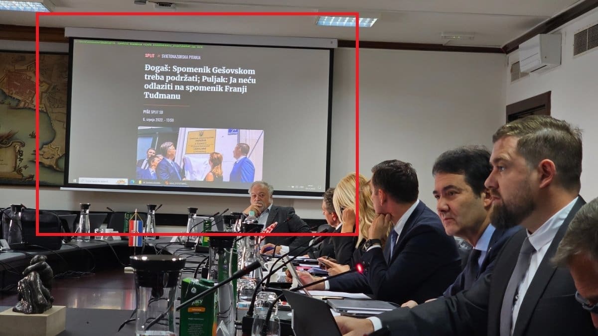 Na video zidu u dvorani gdje se održava sjednica prikazana je fotografija na kojoj se vidi članak iz Slobodne Dalmacije i izjava Zorana Đogaša.
