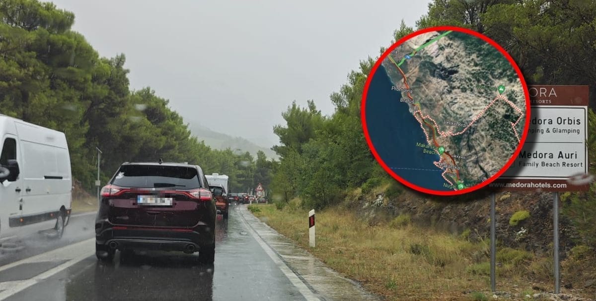 Gužva je vidljiva i na aplikaciji Google Traffic, koja prikazuje kako je put od Baške Vode "obojan" u crveno, što znači da se prometuje izrazito sporo. Promet otežava i kiša koja neprestano pada već od jutra.