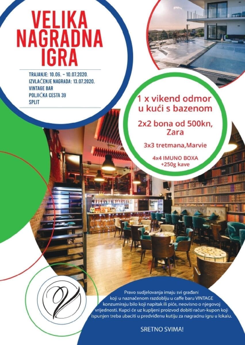 Velika nagradna igra Vintage bara, traje od 10. lipnja - 10. srpnja za sve goste neovisno o visini računa. Vintage nagrađuje s čak 4 različite nagrade pozamašnih količina. Glavna nagrada je vikend odmor u kući s bazenom, zatim 2 x 2 bona od 500 kuna u popularnoj Zari, 3 x 3 tretmana u hotelu Marvie te 4 x 4 Imuno boxa + 250 g kave.