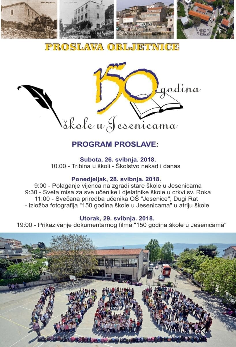 Središnji dio proslave obilježavanja 150 godina školstva i škole u Jesenicama, održati će se u ponedjeljak, 28. svibnja 2018. u prostorima Osnovne škole "Jesenice" - Orij, Dugi Rat. Nakon jutarnjeg polaganja vijenaca pred starom školom u starom selu Jesenice, te svete mise za sve učenike i sadašnje i bivše djelatnike škole u crkvi sv. Roka u starom selu Jesenice, u atriju OŠ "Jesenice" na Oriju održati će se Svečana priredba učenika škole, a posjetitelji će moći razgledati i izložbu fotografija "150 godina škole u Jesenicama". Program će voditi dramska umjetnica Ivana Giove Župa.