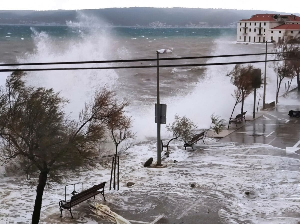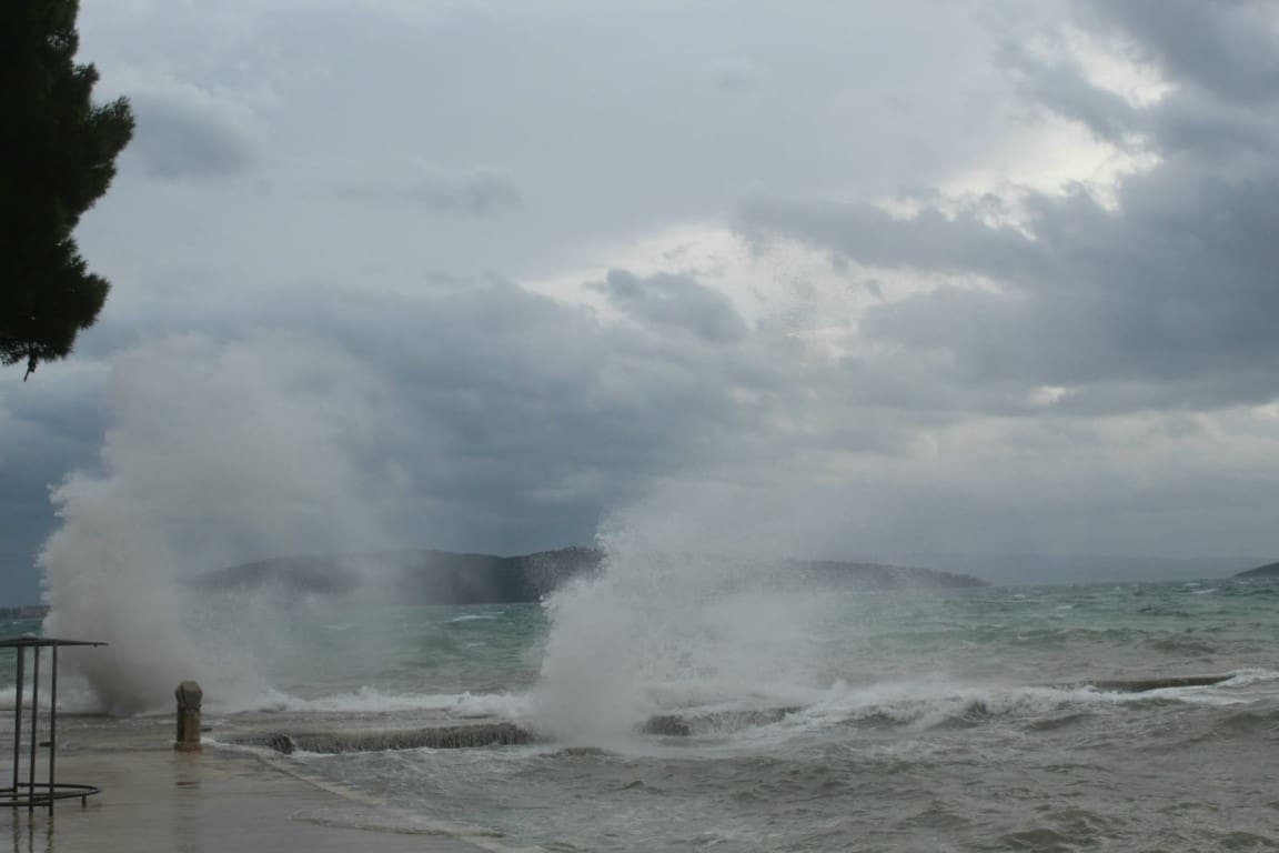 Snažno jugo uzrokuje velike poremećaje u prometu morem, a niski tlak zraka potiče ciklonalnu plimu. Zbog toga su se neki niži dijelovi obale našli pod morem. Ipak, sretna okolnost je da je oko 17 sati vrhunac lunarne oseke, pa obala neće biti ni približno poplavljena kao što bi to bilo da su se poklopile ciklonalna i lunarna plima. Ipak, u drugom dijelu večeri može doći do novog snažnog dizanja razine mora.