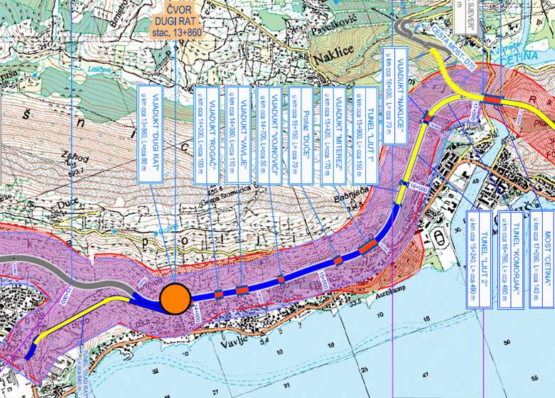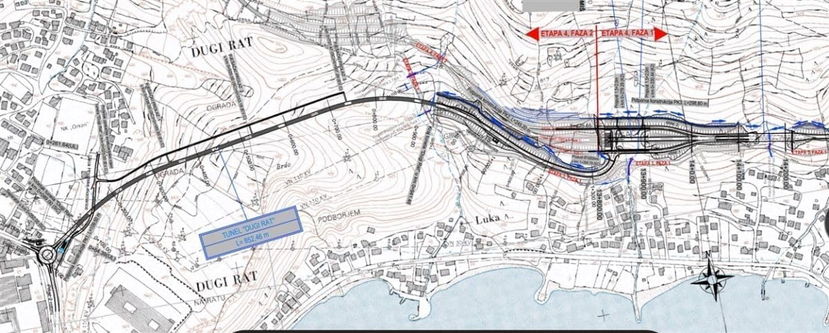 Dionica od Dugog Rata do tunela Komorjak, koji je ključna točka ovog projekta, obuhvaća više faza i građevinskih dozvola. Radovi će uključivati prelaganje i zaštitu instalacija u vlasništvu HOPS-a i HEP ODS-a, prelaganje i zaštitu magistralnog vodovoda, kao i samu izgradnju ceste koja će povezivati Dugi Rat s tunelom Komorjak.