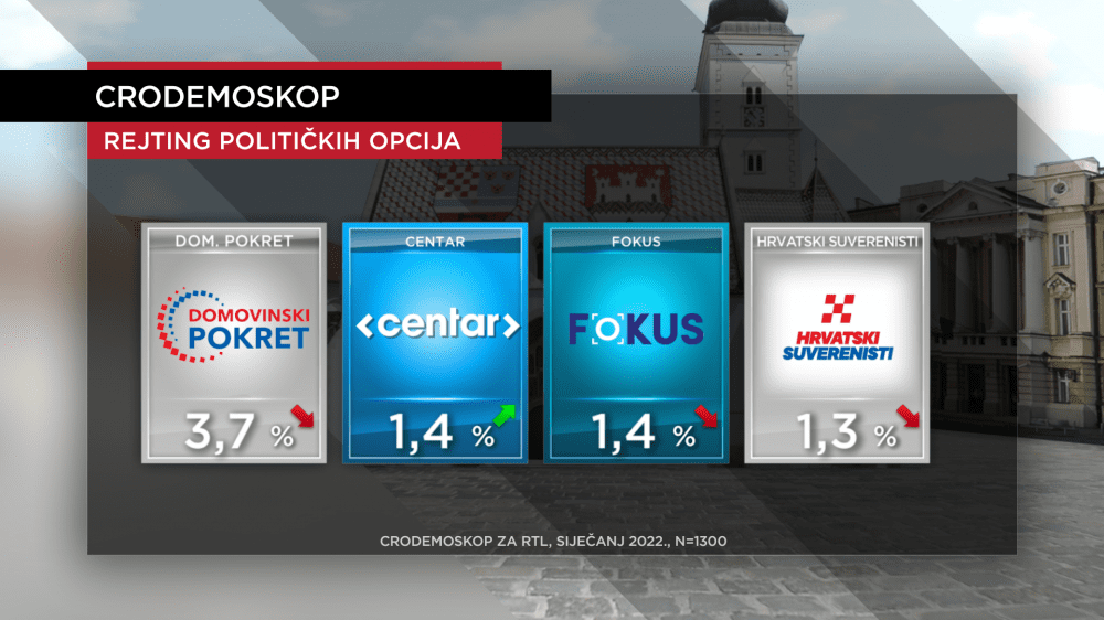 Ostale su stranke ispod 5 posto podrške, Domovinski pokret na 3,7 posto (imali 4,9 posto u prosincu), CENTAR i FOKUS na 1,4 posto (CENTAR u prosincu bio na 1,2 posto, a FOKUS na 1,6 posto), dok je raskol u Hrvatskim suverenistima i izbacivanje Hrvoja Zekanovića zbog stavova o cijepljenju kažnjen padom na 1,3 posto (prosinac 1,5 posto).