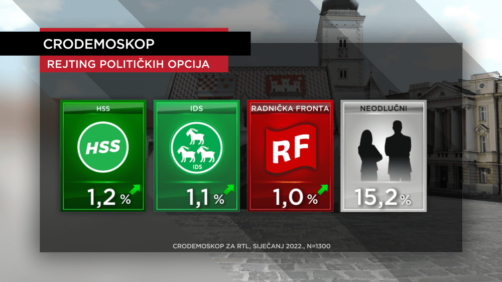Na oko jedan posto podrške još su HSS (siječanj 1,2 posto - prosinac 1,1 posto), regionalni IDS (siječanj 1,1 posto - prosinac 1,0 posto), te Radnička fronta (siječanj 1 posto - prosinac 0,4 posto), svi u blagom rastu. Neodlučnih je oko 15 posto čime su zapravo upravo oni po rejtingu treća snaga u zemlji. To i ne čudi budući da izbora nema na vidiku što je ujedno i šansa onima koji žele provesti nepopularne reforme.