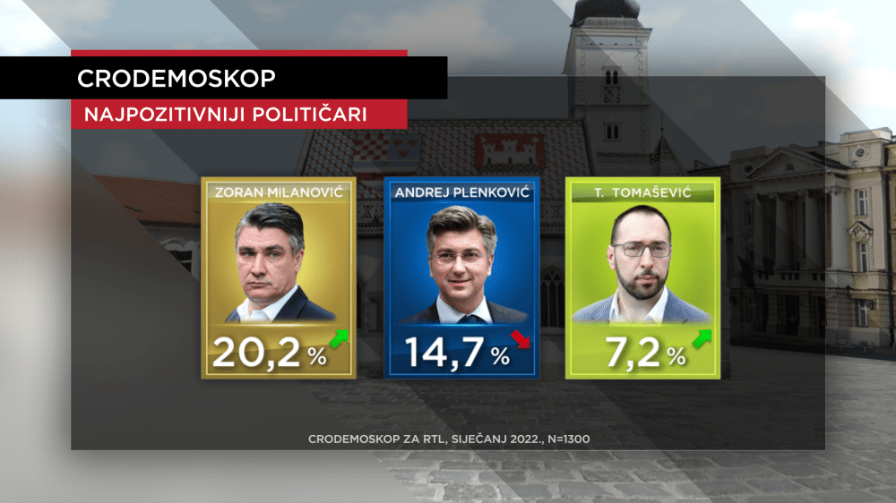 Vodeći na listi najpozitivnijih političara je i dalje predsjednik Republike Zoran Milanović koji u novu godinu ulazi s istom žestinom i retorikom te potporom petine ispitanika (siječanj 20,2 posto - prosinac 19,8 posto). Za razliku od njega premijer Andrej Plenković je u blagom padu, ali i dalje na drugom mjestu s gotovo 15 posto (u prosincu 15,2 posto). Tomislavu Tomaševiću nije naštetilo ukidanje demografskih mjera, najave poskupljenja i brojna nesnalažanja u upravljanju Zagrebom pa je na trećem mjestu pozitivnih s nešto više od 7 posto (prosinac 6,1 posto).