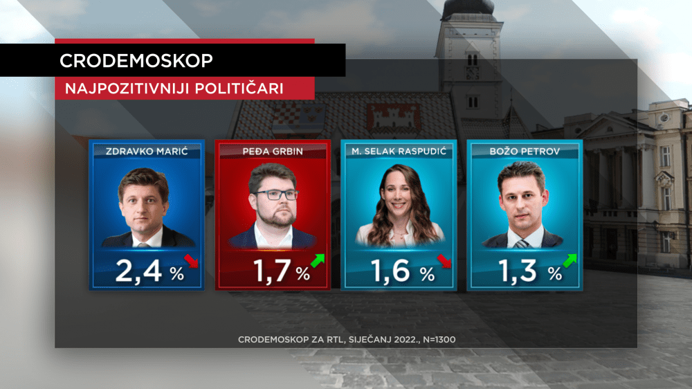 U top deset negativaca još su Gordan Jandroković (siječanj 3,7 - prosinac 2,3 posto), Miro Bulj (siječanj 3,2 posto - prosinac 2,2 posto), Milorad Pupovac (siječanj 2,1 posto - prosinac 2,9 posto), te Vili Beroš (siječanj 1,9 posto - prosinac 1,2 posto).