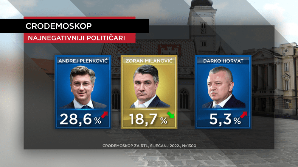 Listu najnegativnijih političara i dalje drži premijer Plenković kojemu negativni trend raste (siječanj 28,6 posto - prosinac 26,1 posto), za razliku od predsjednika Milanovića kojemu postotak negativne percepcije ovaj mjesec pada (siječanj 18,7 posto - prosinac 22,4 posto). I stižemo do najvećeg iznenađenja novogodišnjeg CRO Demoskopa: ministra graditeljstva Darka Horvata ispitanici su kaznili s trećim mjestom najnegativnijih (siječanj 5,3 posto - prosinac 0,5 posto), što i nije čudno s obzirom na ritam obnove, ali i godišnjicu potresa na Banovini, te blagdanima koje su mnogi proveli u kontejnerima.
