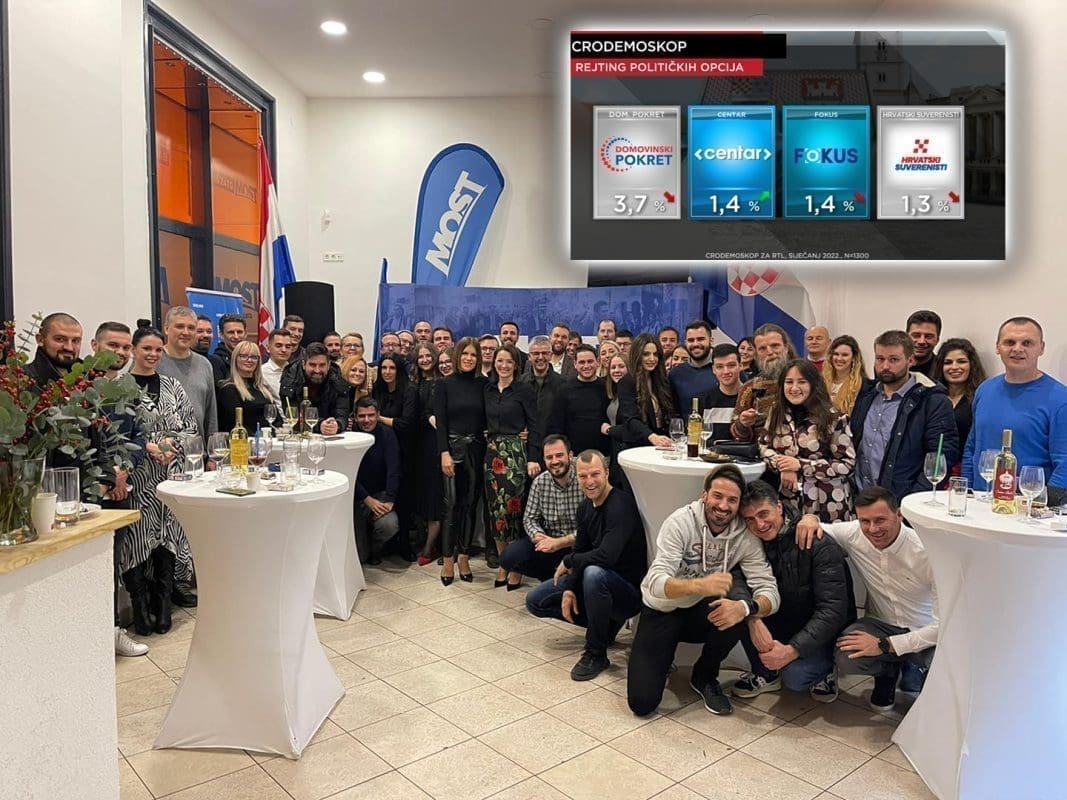 No gusto je u borbi za treće mjesto. Možemo, koji treći mjesec zaredom pada, je i dalje treći (siječanj 13,3 posto - prosinac 14,2 posto), a za vrat mu je zapuhao MOST koji na krilima, tvrde, skupljenih potpisa za referendum protiv COVID potvrda i Nacionalnog stožera stiže na 12,4 posto (prosinac 8,5 posto). To je gotovo 4 postotna poena više nego prošli mjesec, što je skok kakav se rijetko događa.