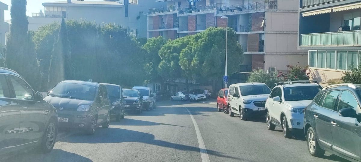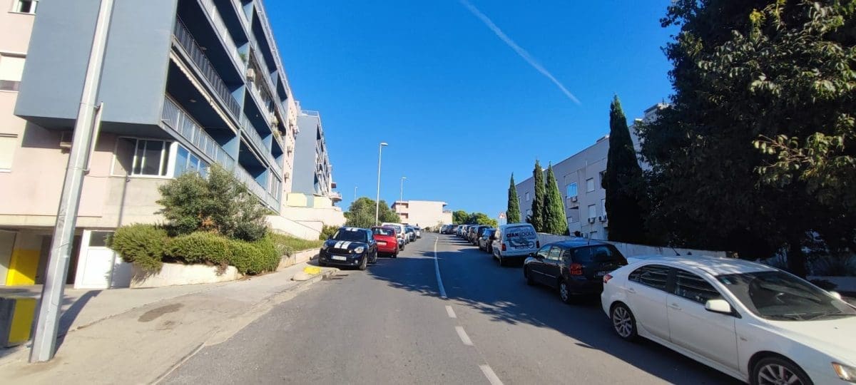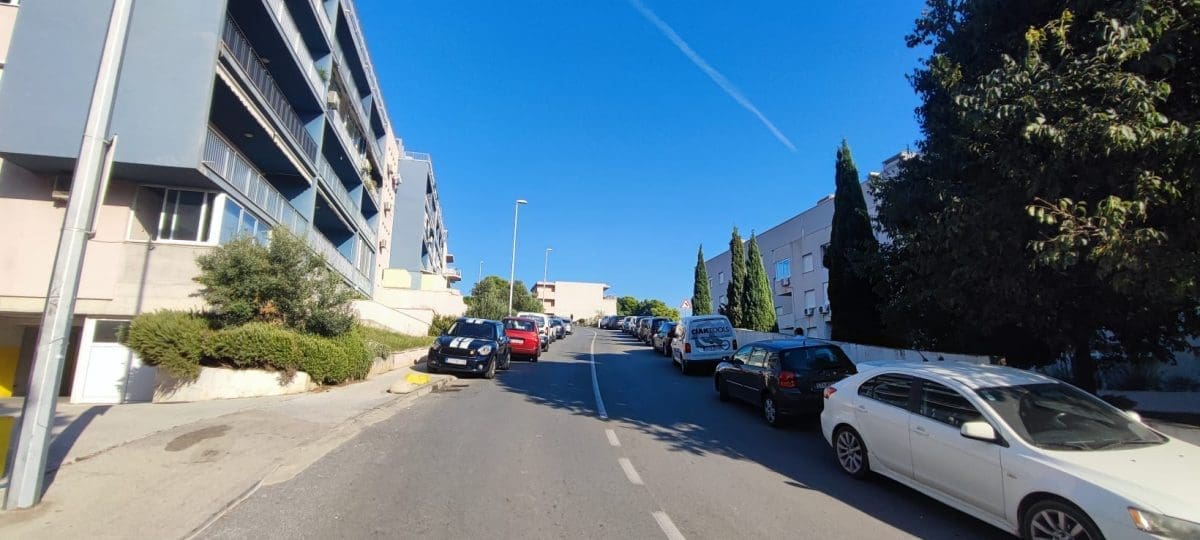 Nakon rotora na križanju Velebitske ulice, Put Radoševca i Put Žnjana automobilom se ne može proći Velebitskom do platoa jer je postavljen prometni znak koji upozorava da cestom mogu proći samo vozila gradilišta i stanari. Međutim, osim znaka, nitko ne nadgleda tko zaista prolazi cestom. Mi smo prošli i fotografirali vozila parkirana dijelom na kolniku i pločniku. Stanari koji imaju garažu, poput Jadranke, kažu nam kako nemaju tih problema dok se ostali moraju snaći kako god znaju i umiju. Prema viđenom, ulica je teško prohodna, a dva se vozila ne mogu mimoići. Vozila su, silom prilika, čak parkirana pored prometnog znaka za zabranjeno zaustavljanje i parkiranje.
