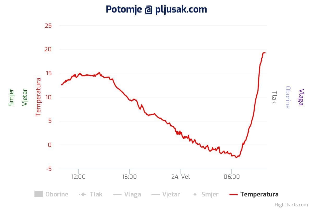 Zvjezdano selo Mosor noćas je mjerilo 15 stupnjeva Celzijevih, a Žrnovnica u podnožju 5 stupnjeva.