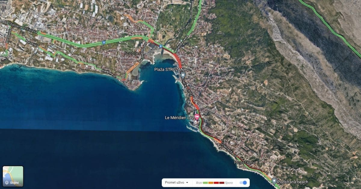 Tamo se cijelo prijepodne stvaraju veće gužve. Sredinom dana najveće gužve zabilježene su u smjeru Splita, kroz Podstranu. Kolona se sporo kreće, a prave gužve mogle bi nastati ako se ostvare prognoze popodnevnih pljuskova što bi dio kupača moglo natjerati na raniji odlazak s plaža.