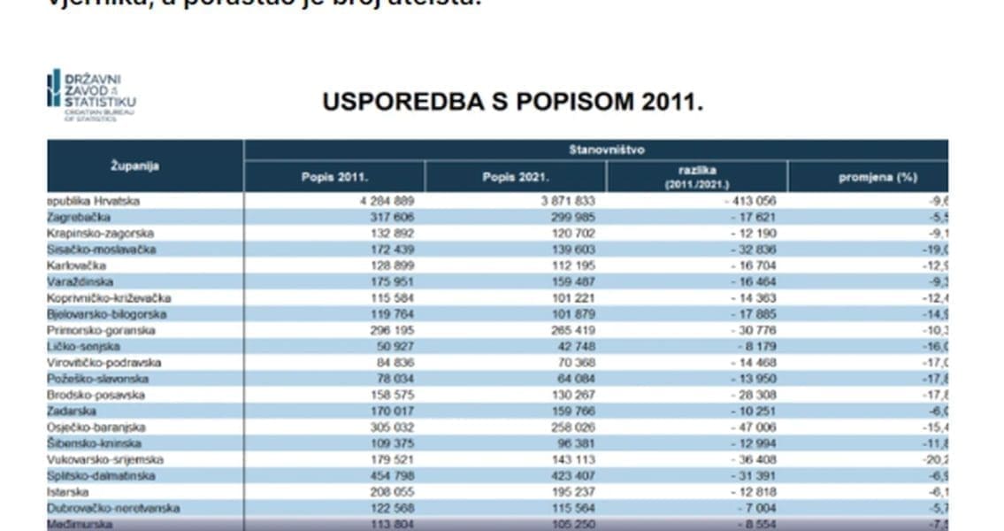 Najmanji pad stanovnika zapažen je u Gradu Zagrebu, 2,90 posto i u Zagrebačkoj županiji 5,55 posto. Slijedi Dubrovačko-neretvanska županija s padom od 5,71 posto, Zadarska 6,03 posto, Istarska 6,16 i Međimurska s padom od 7,52 posto.