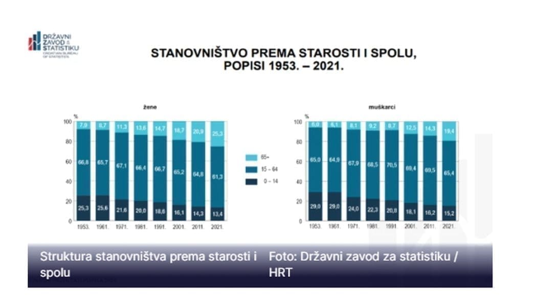 Udio žena do 14 godina starosti 1953. iznosio je 25,3 posto, a 2021 je pao na 13,4 posto. Udio žena starijih od 65 godina 1953. iznosio je 7,9 posto, a 2021. se popeo na 25,3 posto. Udio najmlađeg uzrasta muškaraca 1953. iznosio je 29 posto, a 2021. 15,2 posto; dok je udio najstarije dobne skupine muškaraca 1953 iznosio 6 posto, a 2021 19,4 posto.
