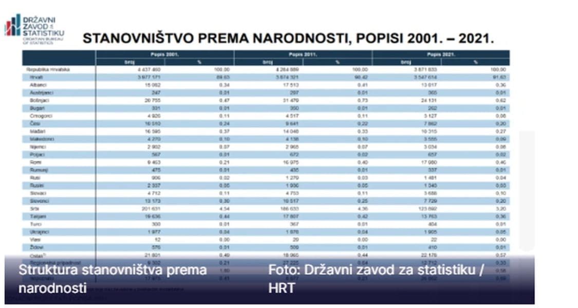 Državni zavod za statistiku objavio je konačne rezultate Popisa 2021. o ukupnom stanovništvu prema spolu i starosti, te prema narodnosti, vjeri, državljanstvu i materinskom jeziku.