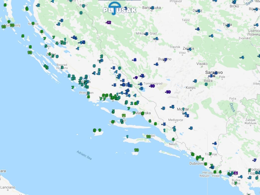 Prema podacima mreže postaja Pljusak.com, -6°C je jutros izmjereno u Gali, Bisku, Trilju, Sinju, Otoku, Grudi. -5°C je bilo u Hrvacama, Staševici, Vinaliću i Muću. Najtoplije je jutros bilo u Korčuli, Bolu i Velom Ratu na Dugom Otoku.