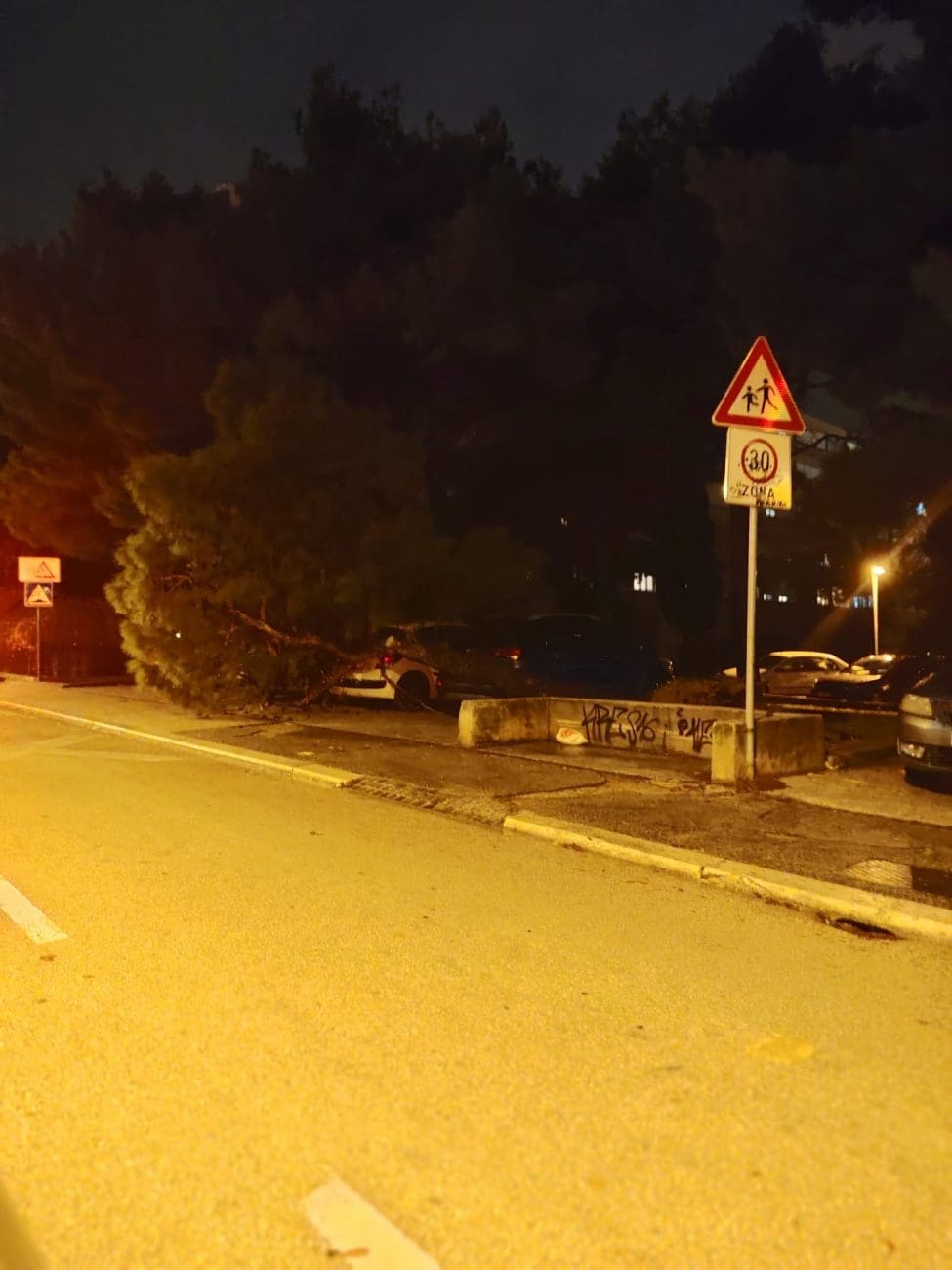 Veliki bor iznenada se danas srušio na Skalicama pored osnovne škole. Srećom, nitko od prolaznika i učenika nije ozlijeđen. Stablo je pritom palo na nekoliko parkiranih automobila te uzrokovalo manju štetu.