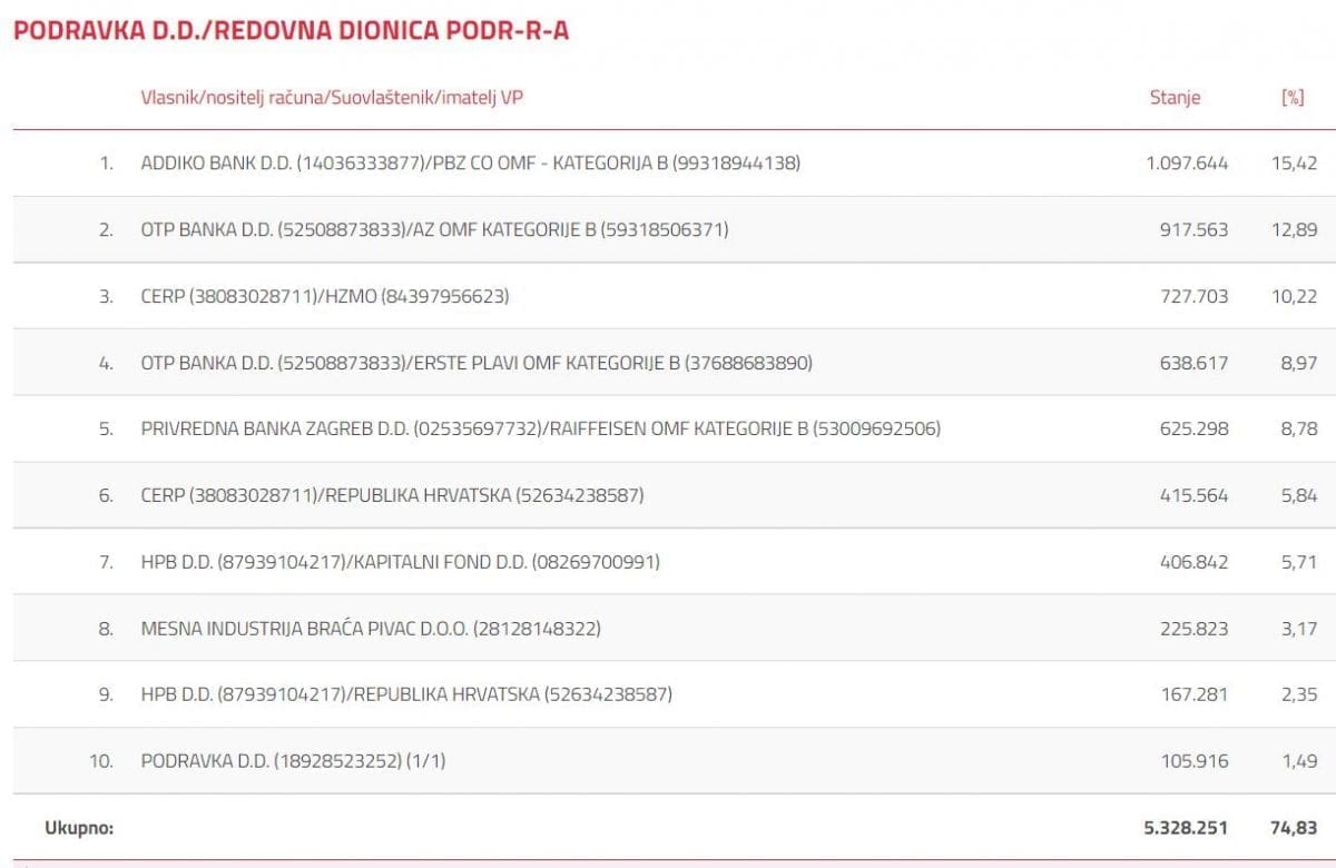 Od utorka upravo se pod njihovim imenom, a ne više skrbničkim računom u OTP banci, vodi kako imaju čak 225.823 dionice, što je 3,17 posto vlasništva Podravke. Riječ je o paketu dionica danas tržišno vrijednom čak 140 milijuna kuna jer je dionica nakon vijesti o Pivcima jučer skočila na 616 kuna, najviše od travnja 2007. godine, piše Danica.