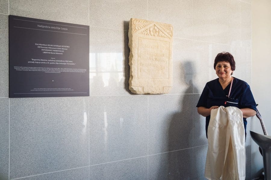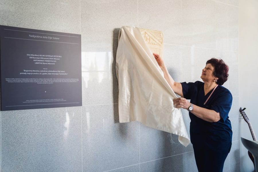 "To je nadgrobna ploča primalji, iz stare Salone, koja je otkrivena u dva navrata. Prvi dio prije sto godina, drugi dio prije 70 godina. U dogovoru s Arheološkim muzejem ploča je restaurirana i sad postavljamo njenu repliku. Ona govori da je u vrijeme stare Salone postojalo primaljstvo kao priznata vještina i struka, što govori koliko daleko u povijest seže naše znanje i naša struka. Već u to vrijeme su se porođaji obavljali na stručan način. To je jako značajno jer pokazuje da se nismo mi danas ovdje pojavili s našim znanjem iz ničega već je to znanje rezultat tisućljetne tradicije u vođenju porođaja i trudnoće", kazao nam je predstojnik Klinike za ženske bolesti i porode KBC-a Split dr. Marko Mimica.