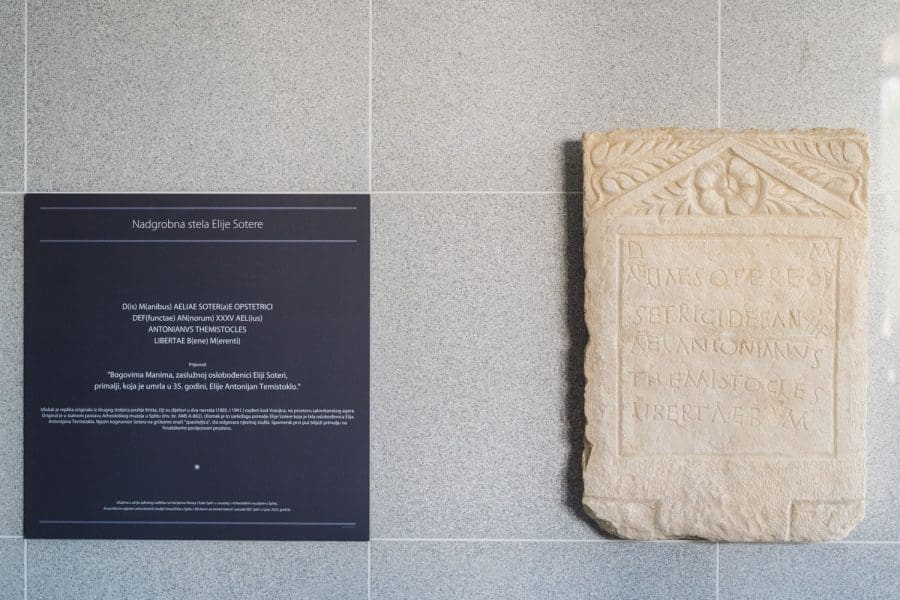 Danas u 13 sati u atriju Klinike za ženske bolesti i porode KBC-a Split otkrivena je replika nadgrobne stele primalje Elije Sotere iz drugog stoljeća nakon Krista. Original je nađen u dva dijela (1885. i 1941.) kod Vranjica, na prostoru salonitanskog agera i u stalnom je postavu Arheološkog muzeja u Splitu. Prvi dio je pronašao don Frane Bulić 1885. godine, a drugi dr. Mihovil Abramović 56 godina kasnije (1941.). Trebalo je proći još 12 godina da bi prof. Duje Rendić Miočević 1953. povezao oba ulomka i pročitao tekst stele u cjelini. Nadgrobna stela je podignuta primalji Eliji Soteri, oslobođenici Elija Antonijana Temistokla. Kognomen Sotera na grčkome znači "spasiteljica", što odgovara njezinoj službi.